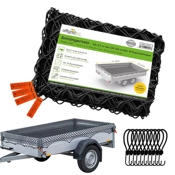 Filet de remorque 1,5x2,7m à 2,5x3,5m incl. marquage d'angle et 10 pièces crochets tendeurs - extensible et à mailles serrées
