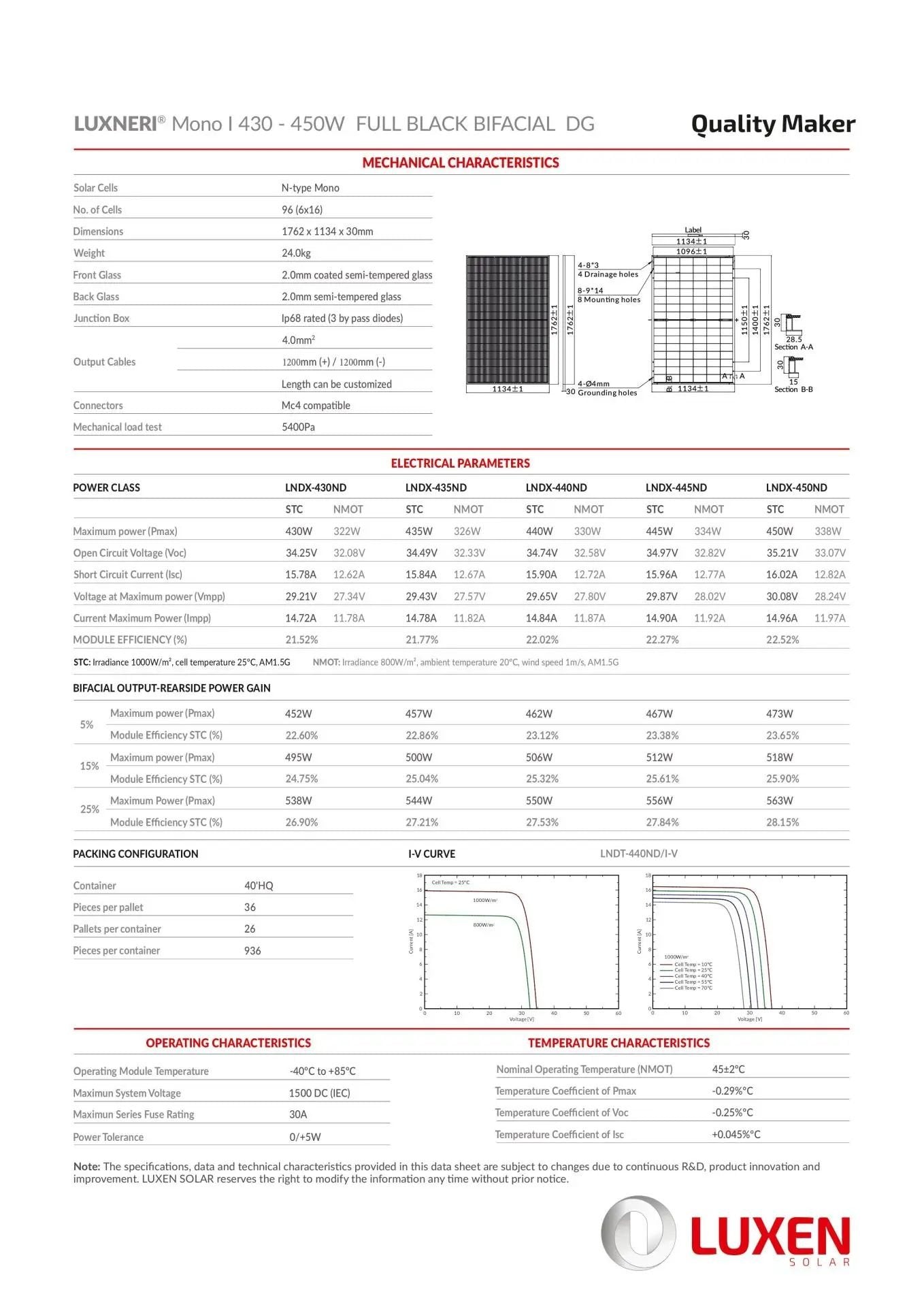 Le module Trina Solar Vertex S+ offre une puissance de pointe de 445W et utilise des technologies de pointe telles que les cellules TOPCon monocristallines et le double vitrage. Ces technologies garantissent une efficacité et une fiabilité élevées, même dans des conditions météorologiques extrêmes.