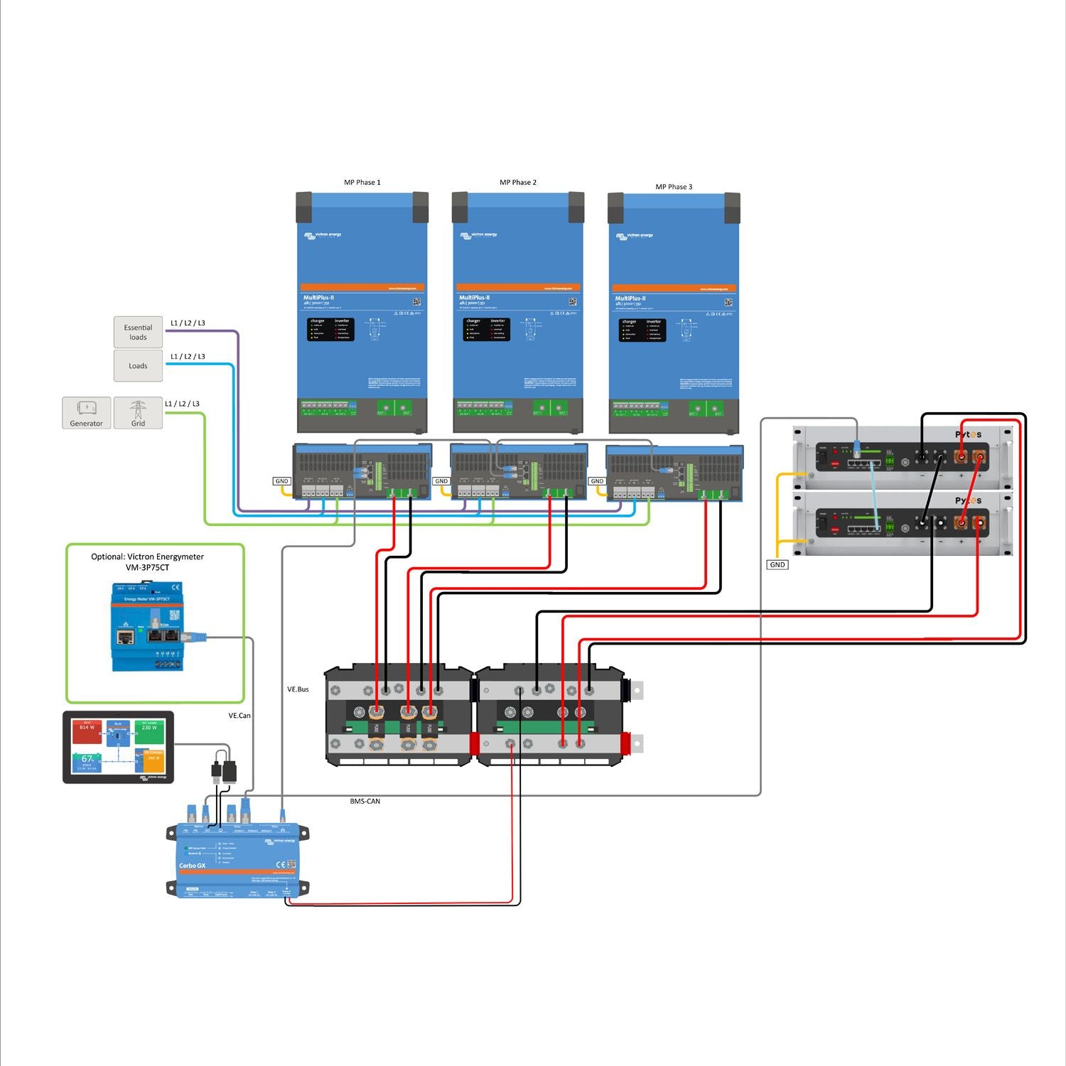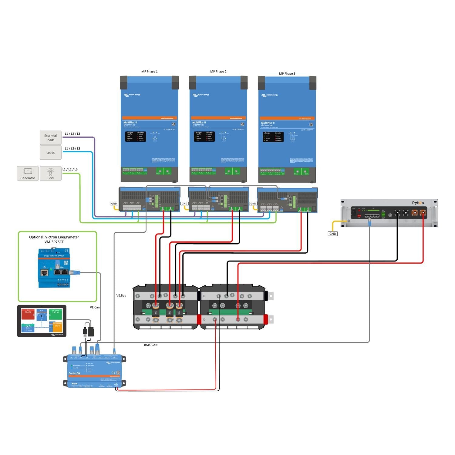 I sistemi di backup trifase sono ideali per l'alimentazione di emergenza o per l'espansione di un sistema solare esistente. Con potenti batterie agli ioni di litio di Pytes, una combinazione di dispositivi MultiPlus-II adatta e un Cerbo GX MK2 per il monitoraggio del sistema, puoi garantire la tua fornitura di energia anche in caso di interruzione di corrente.