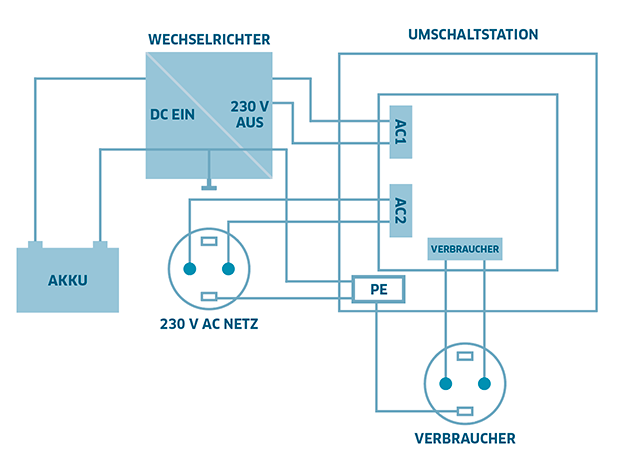 Der Wechselrichter wird mit dem Eingang AC2 (höhere Priorität) verbunden. Der Strom wird primär über den Wechselrichter aus dem Akku entnommen (z.B. beim Einsatz von Solar-Insel-Systemen). Erst wenn der Wechselrichter wegen Tiefentladeschutz abschaltet, wird das 230 V AC Netz über den Eingang AC1 zugeschaltet.