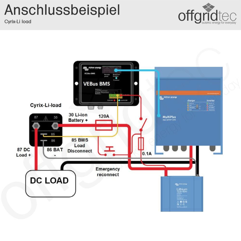 Der Cyrix-Li-Load schaltet ab, sobald sein Steuerungseingang den Zustand "free floating" erreicht. Wenn die Batteriespannung nach dem Abschalten wieder ansteigt (was geschieht, wenn keine weiteren Lasten angeschlossen sind), wird der Ausgang des BMS aktiviert und der Cyrix schaltet nach 30 Sekunden wieder ein. Nach drei erfolglosen Einschaltversuchen bleibt der Cyrix abgeschaltet, bis die Spannung mindestens 30 Sekunden lang über 13 V (bzw. 26 V oder 52 V) angestiegen ist, was anzeigt, dass die Batterie wieder aufgeladen wird.